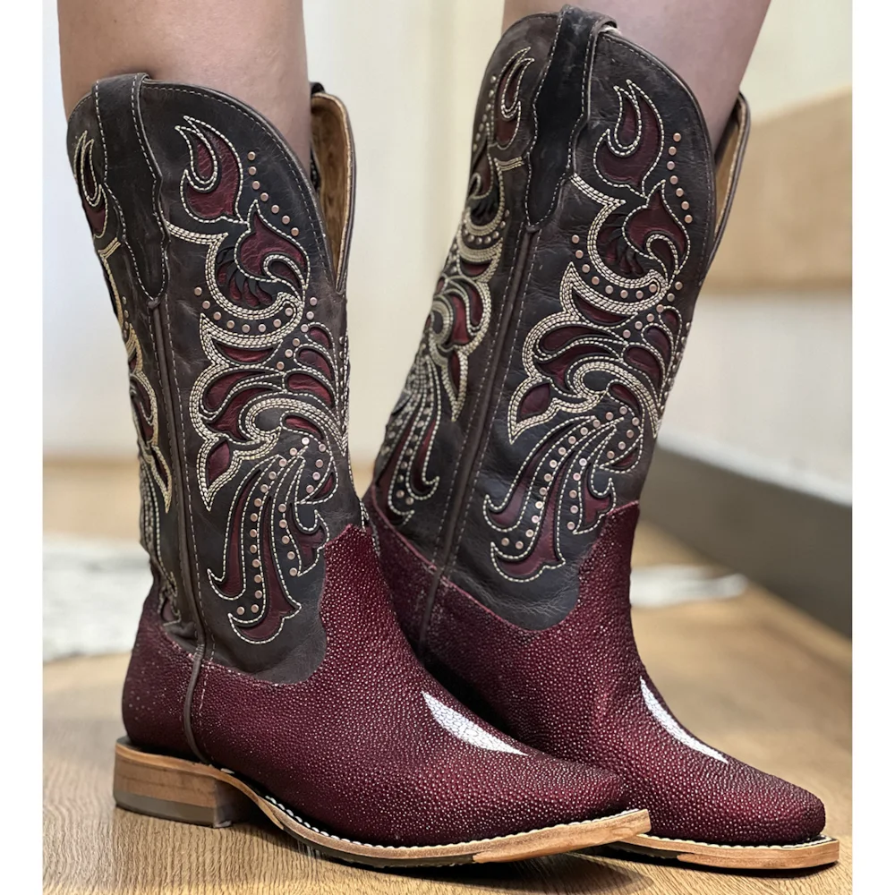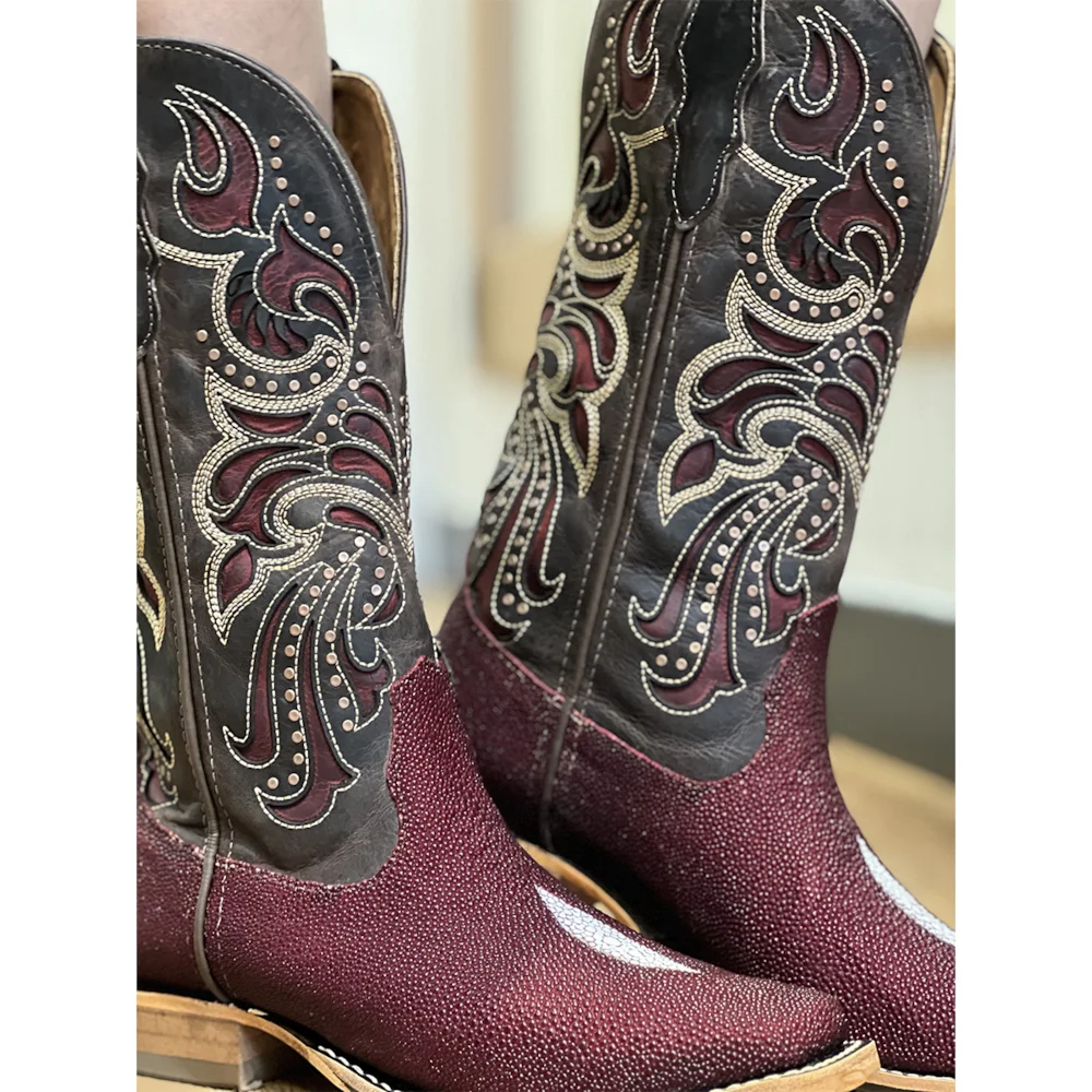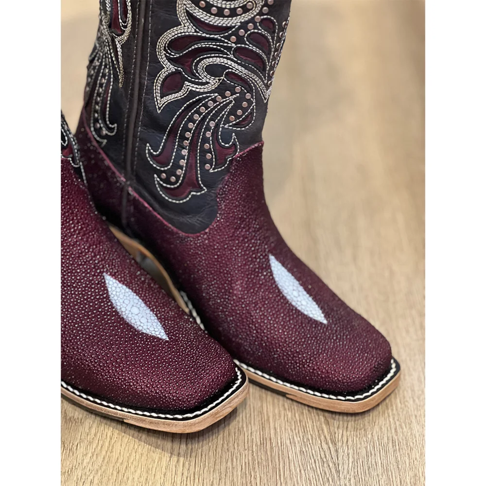 Pé fabricado em couro legítimo de Arraia na cor Vinho. Bico quadrado.