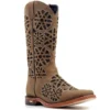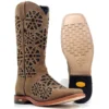 Pé fabricado em couro Bovino na cor Mustang Havana. Bico Quadrado, com entalhes, bordados e brilho dentro do entalhe.