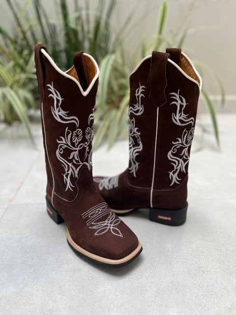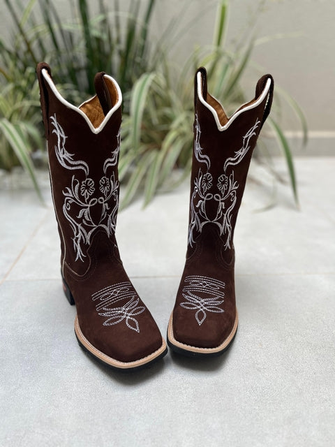 Bota Texana Bordado Flores Branca Couro Nobuck Marrom fabricada toda com couro 100% legítimo.