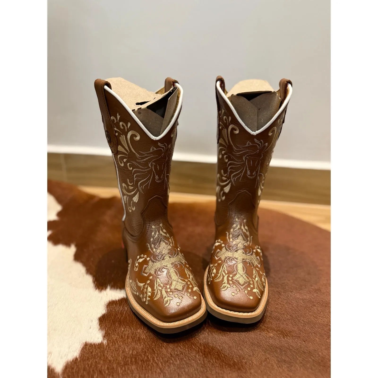 Bota Texana – Couro Látego Mustang Bordado Cruz + Cavalo + Nossa Senhora