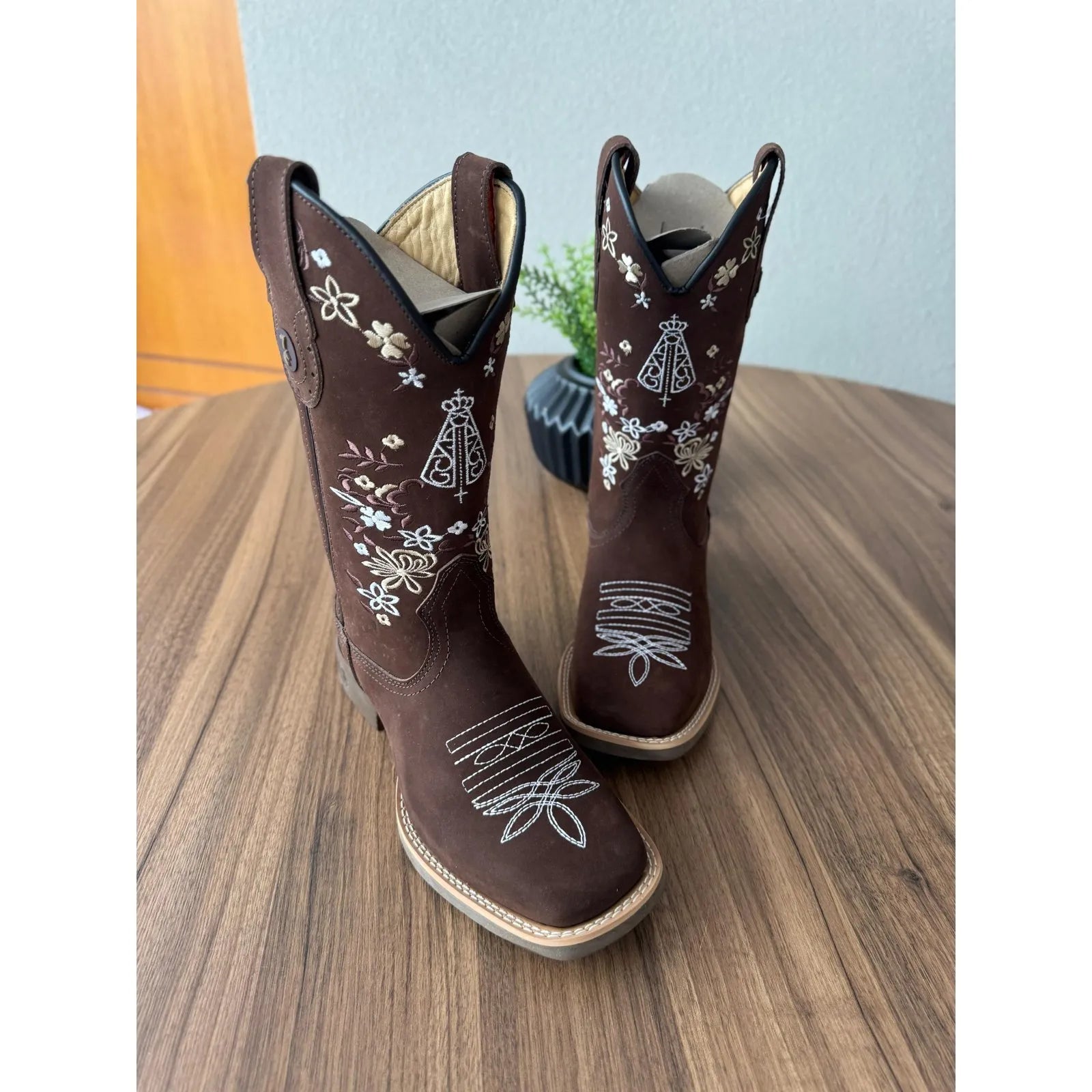 BOTA TEXANA – COURO NOBUCK CHOCOLATE BORDADO PADROEIRA E FLORES
