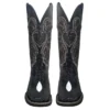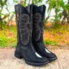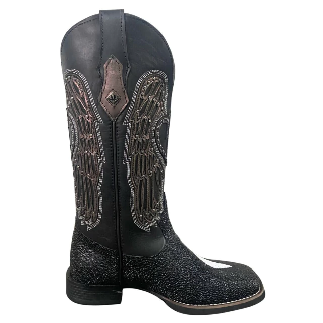 Com bico quadrado e acabamento de alta qualidade, esta bota é confeccionada em couro bovino réplica Arraia na cor preto. O cano alto de 35 cm, adornado com brilhos e detalhes, confere um toque especial ao seu visual.