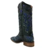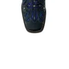 Pé Fabricado em couro legítimo de boi, na cor Fossil Preto, com bordados nas cores Azul Petróleo e Cinza, detalhes vazado com fundo em Glitter Craquele Azul e aplicação de rebites de metal. Bico quadrado.
