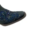 Cano, também em couro bovino na cor Fossil Preto, com bordados nas cores Azul Petróleo e Cinza, detalhes vazado com fundo em Glitter Craquele Azul e aplicação de rebites de metal. Possui puchador de couro nas laterais, facilitando o calçar.