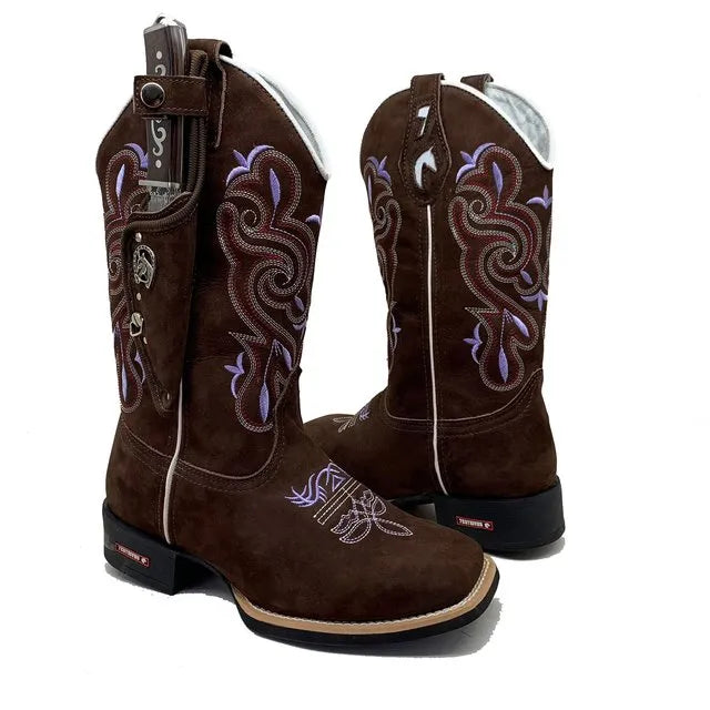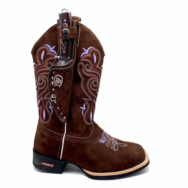 BotaFaca Heloísa – Couro Nobuck Chocolate | Bordado Roxo e Branco