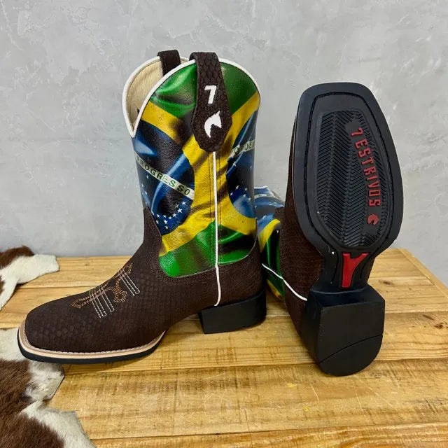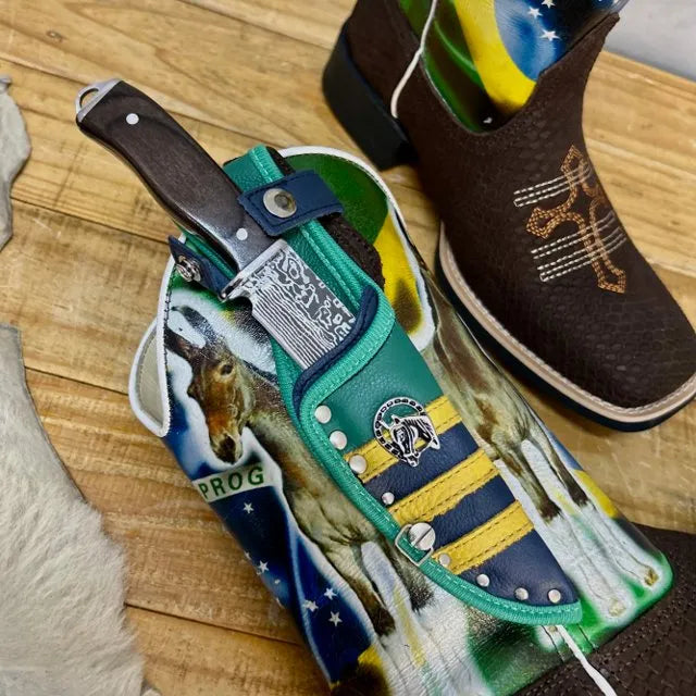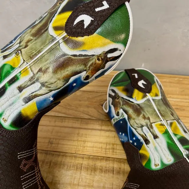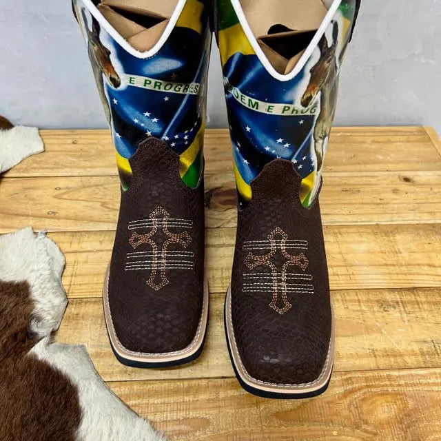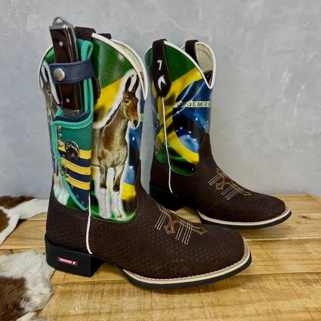 BotaFaca Muladeiros do Brasil – Couro Cano Nobuck Cru com Estampa | Couro Gáspea Nobuck Chocolate Estilizado em Tilápia | Florão com Cruz e Bainha Brasileira