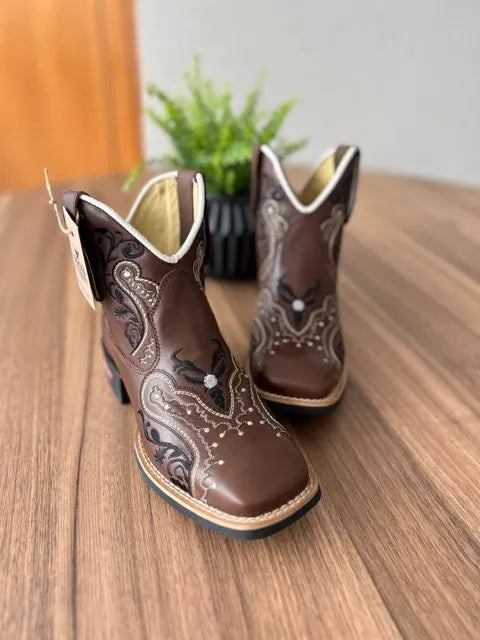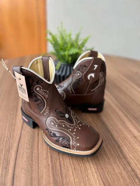 Botina Cano Médio Alice – Couro Látego Marrom/Bordado Tribal Preto