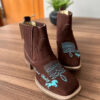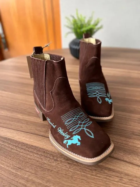 Botina Hariel – Couro Nobuck Marrom/ Bordado Cavalo Azul