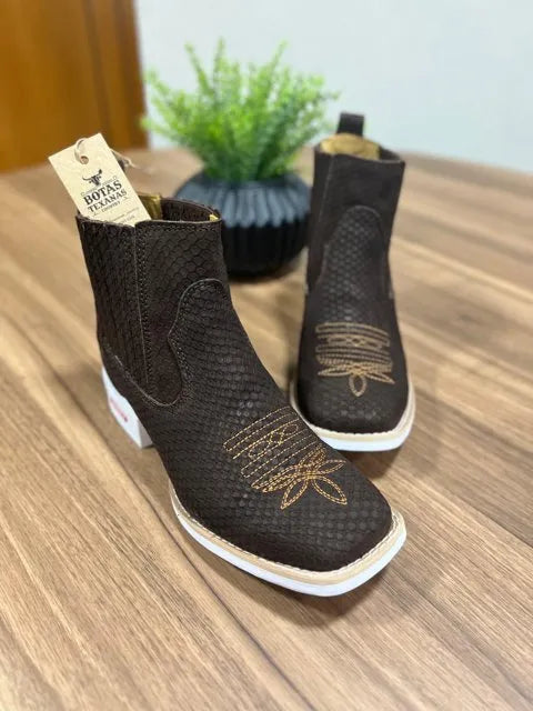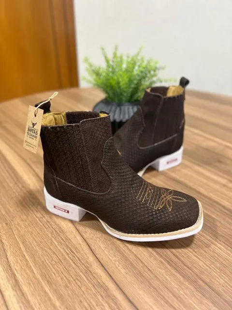 Botina Henry – Couro Tilápia Marrom/Bordado Florão Laranja