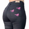 Seus bolsos espaçosos oferecem praticidade, enquanto o detalhe em bordado de cavalinho rosa confere um charme especial à peça. A barra da calça desfiada traz um toque moderno, garantindo que você esteja sempre na moda.