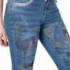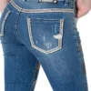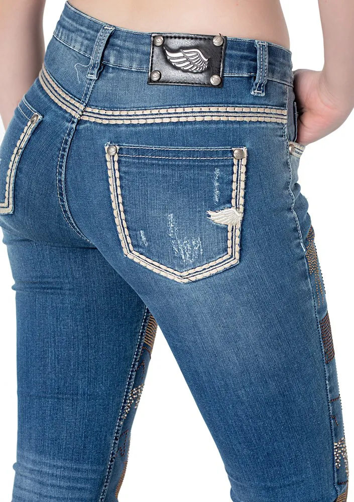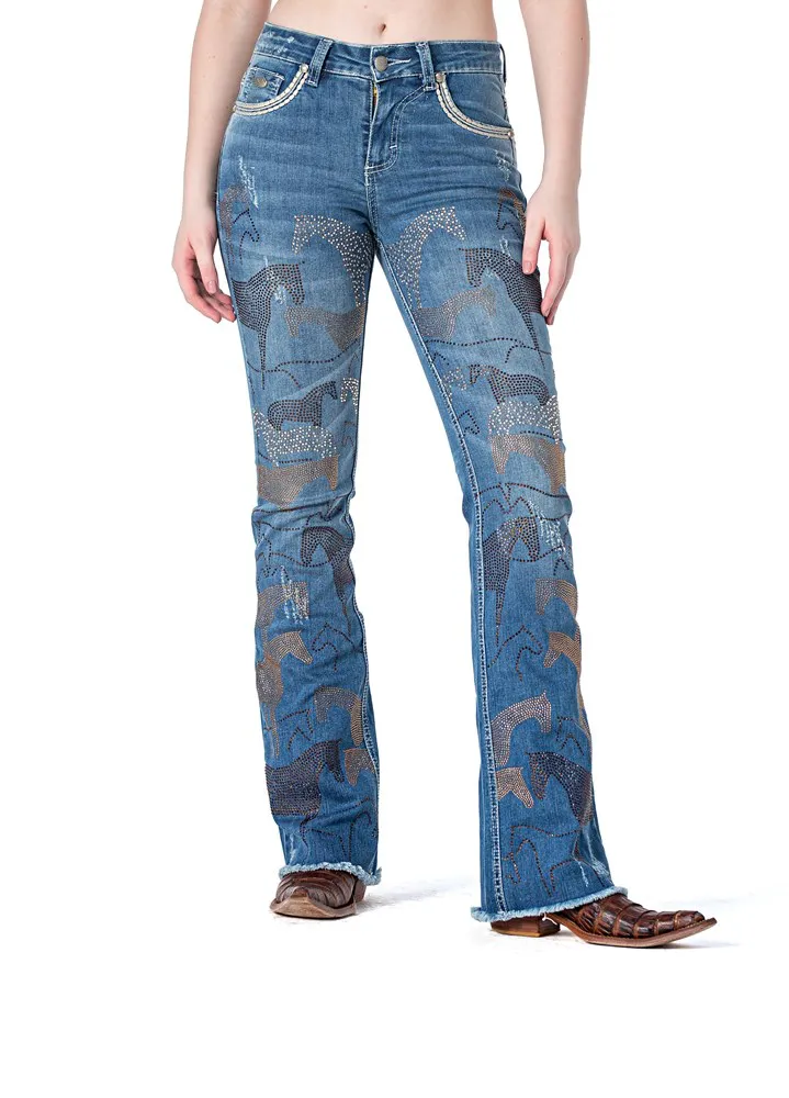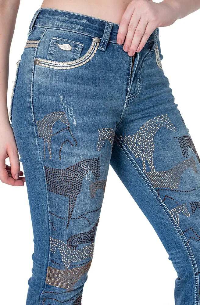 Jeans country feminino, lavanderia media decorado com pedras brilhantes em tons de bege e marrom, formando padrao de cavalos por toda a frente. Aviamentos personalizados.