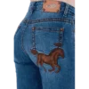 Detalhe: Bolso traseiro com cavalo bordado, detalhe na barra atras com strass