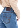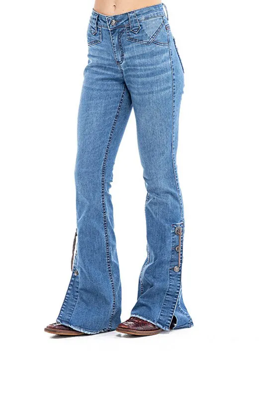 Calca jeans country modelagem flare em cos medio. Bordado com pontos decorativos na pala e bolsos frente e costas. Barra com abertura nas laterais e botoes de metal.