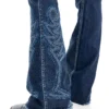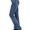 Calca jeans country modelagem flare com cos medio. Fechamento frontal em botoes e barra a fio desfiada. Possui bordado de arabesco nas pernas decorado com cristais em tom de azul. Boca de bolso frontal e bolsos traseiros com bordado decorativo. Aviamentos personaliazados.