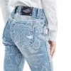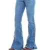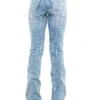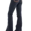Calca jeans country modelagem flare em cos medio. Bordado com pontos decorativos na pala e bolsos frente e costas. Decoracao de estampa a laser em padronagem paisley com sobreposicao de pedraria brilhante.