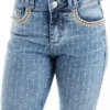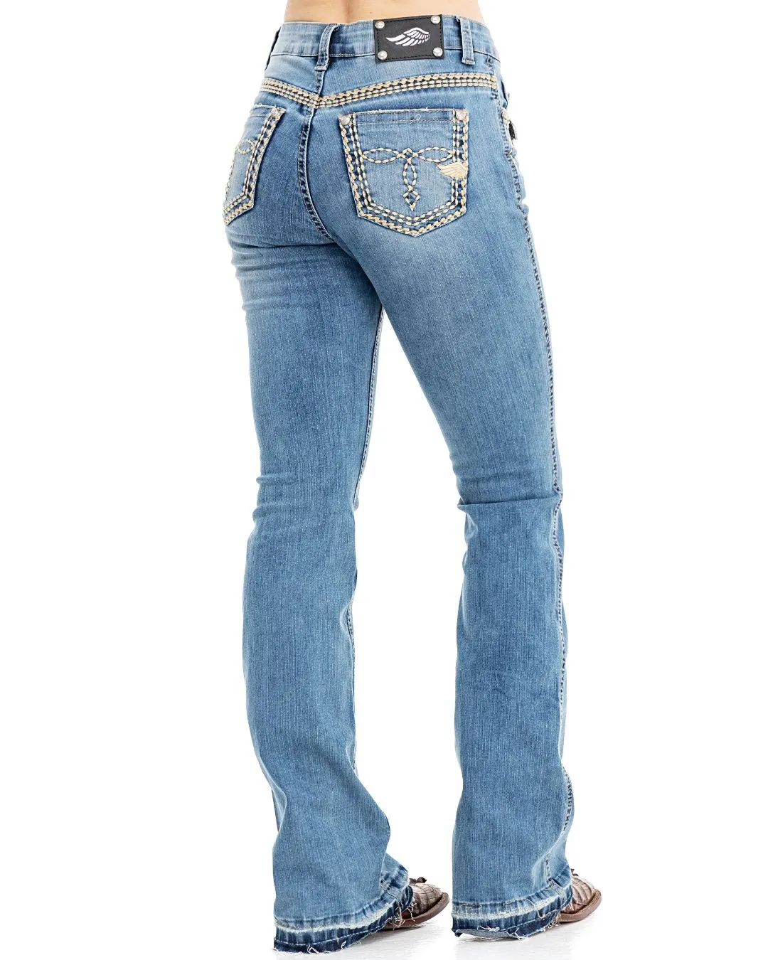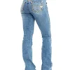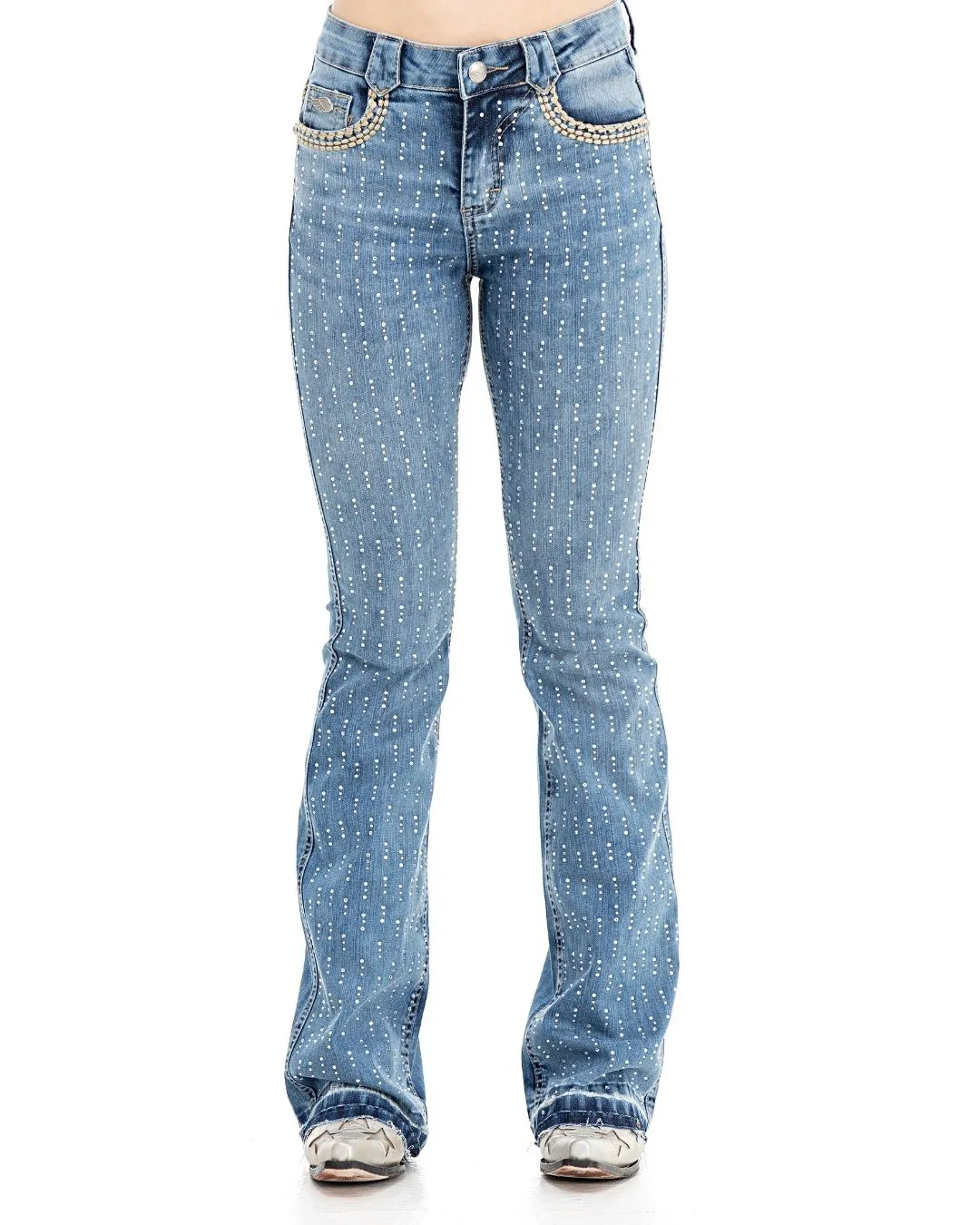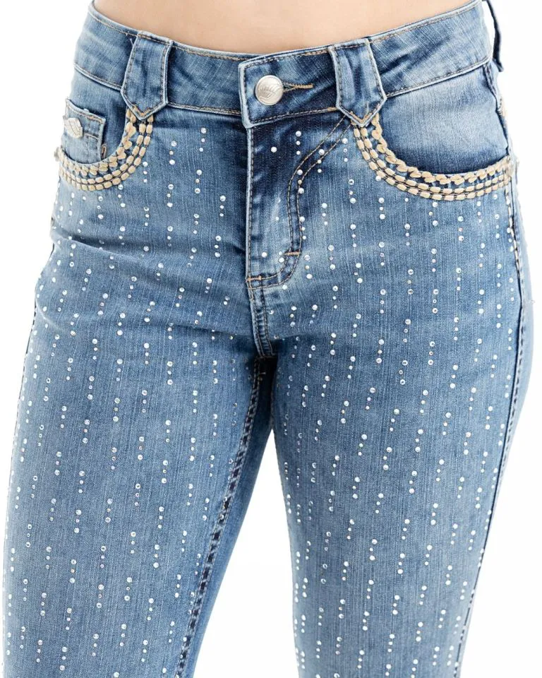 Calca country feminina modelagem flare cos medio. Cristais brilhantes por toda a peca em tons furtacor. Bordado decorativo de pontos rusticos na pala, boca de bolso frontal e bolso traseiro. Lavanderia estonada. Aviamentos personalizados.