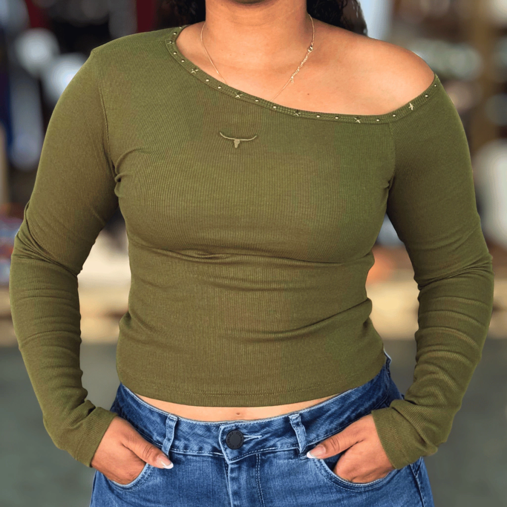 A Camiseta Canelada Manga Longa é a peça ideal para quem busca um visual atual e cheio de personalidade. Seu diferencial fica por conta do detalhe aberto no ombro, adornado com estrelas de metal que trazem um toque moderno e sofisticado ao look.