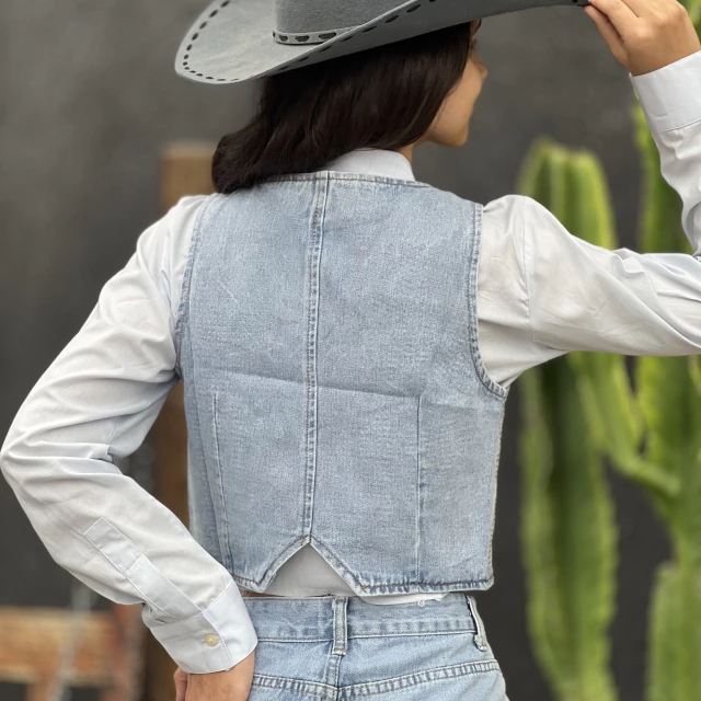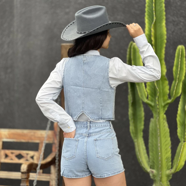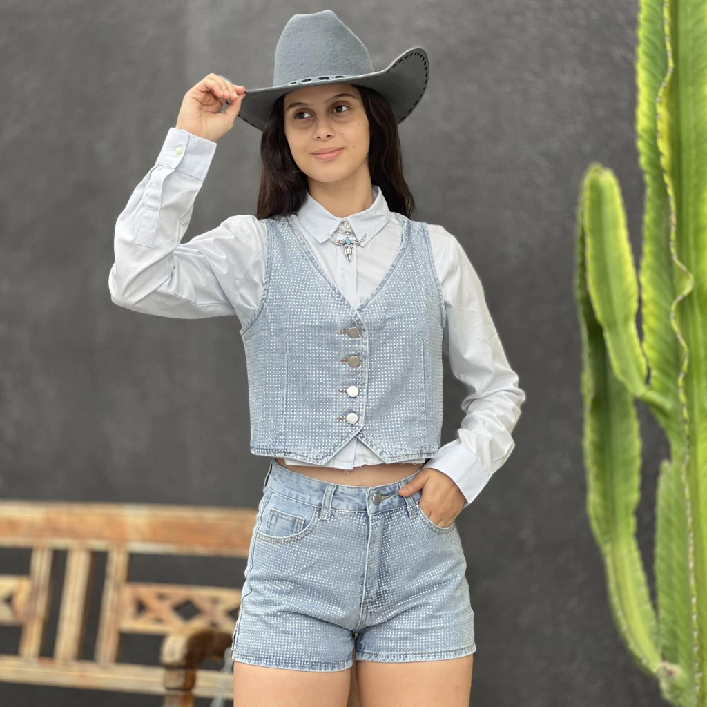 Se você busca um look deslumbrante para brilhar nos eventos country e baladas, o Conjunto B&C Shorts e Colete Lola Shine é a escolha perfeita! Composto por um colete acinturado e shorts curto, ambos no jeans escuro com aplicação de strass, esse conjunto une estilo e autenticidade para um visual marcante e cheio de atitude.