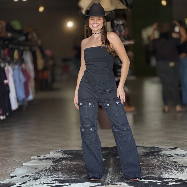 Feito em jeans 100% algodão, o conjunto é confortável e versátil, ideal para rodeios, festas ou momentos descontraídos. A barra do top em formato de bico e o fechamento em zíper valorizam a silhueta, garantindo um toque fashion e autêntico em qualquer ocasião.