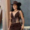 O conjunto feminino Outlaw é a escolha perfeita para quem busca um visual marcante e cheio de atitude no estilo country. Confeccionado em suede na cor marrom, é composto por calça wide leg e top cropped, formando um look moderno e autêntico.