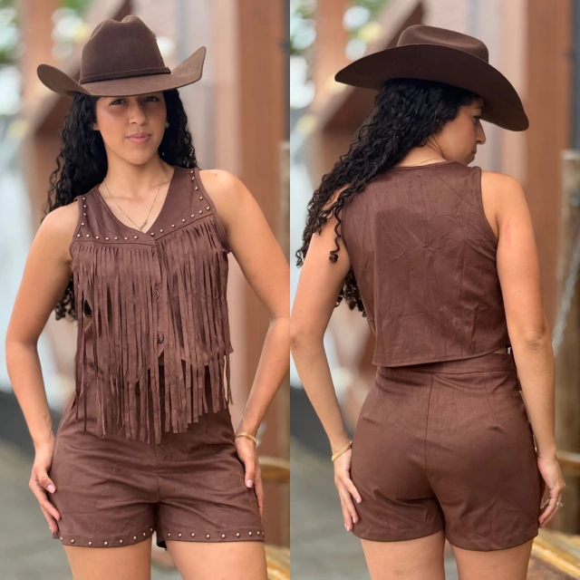 O colete possui fechamento frontal por botões marrons, além de franjas e aplicação de tachas na parte frontal, criando um visual imponente. Já o shorts conta com modelagem de cós alto, bolsos faca e aplicação de tachas no barrado frontal, garantindo estilo e conforto.