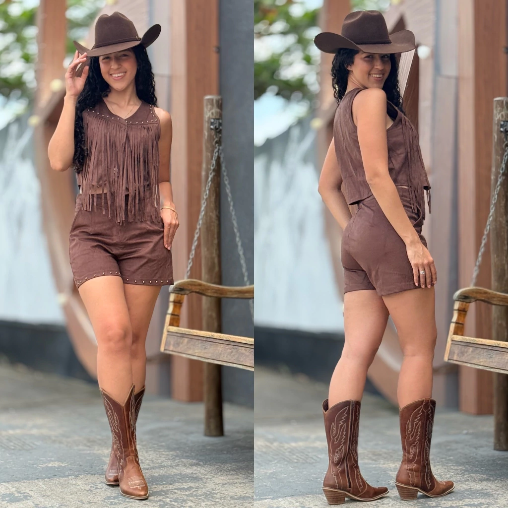 O conjunto Austin Rodeo é perfeito para quem busca um visual country moderno e cheio de personalidade. Confeccionado em suede na cor marrom, traz um toque sofisticado e marcante para compor produções autênticas.