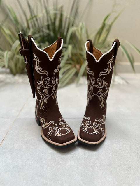 Kit Texana Bordado Flores Couro Nobuck Marrom + Bainha + Faca fabricada toda com couro 100% legítimo.