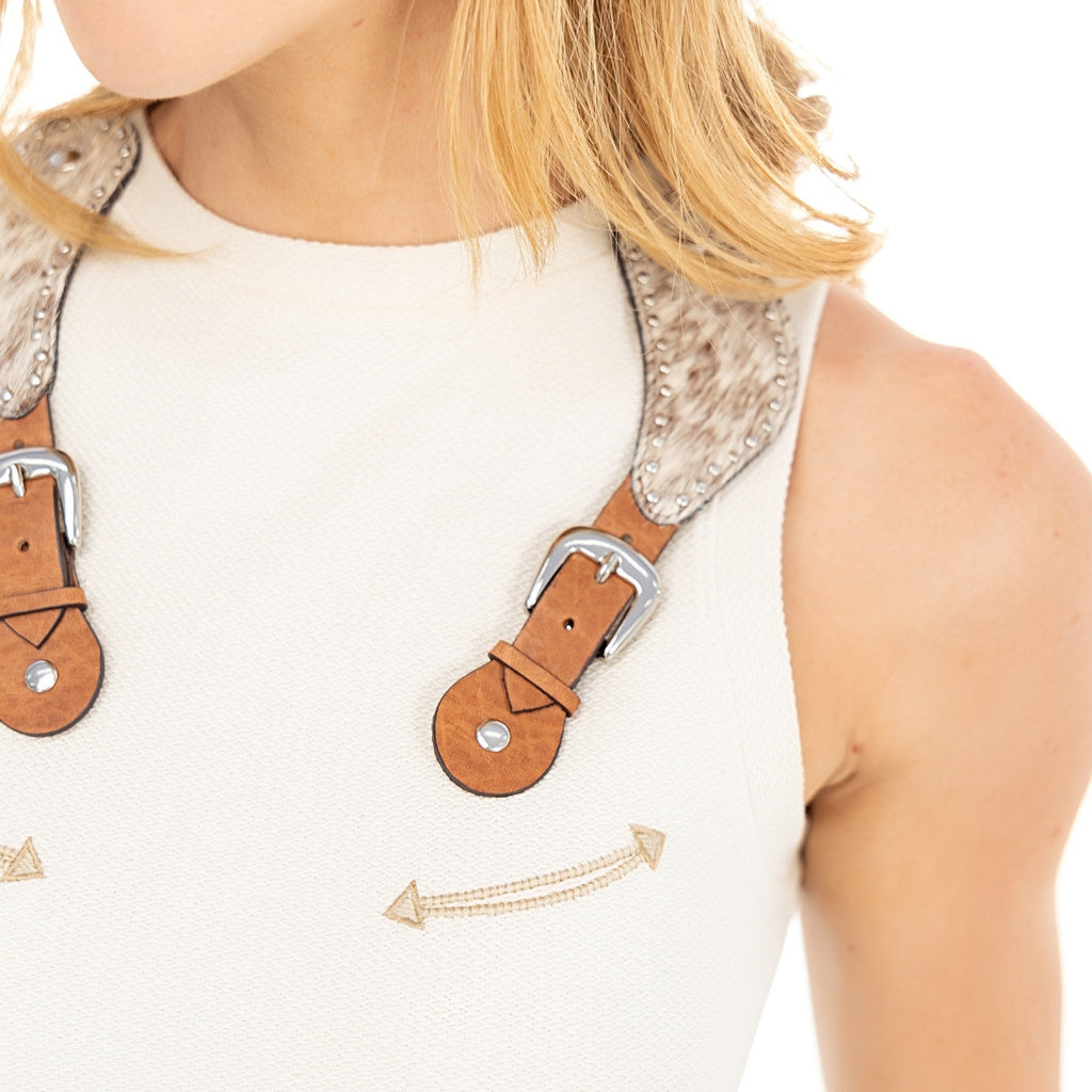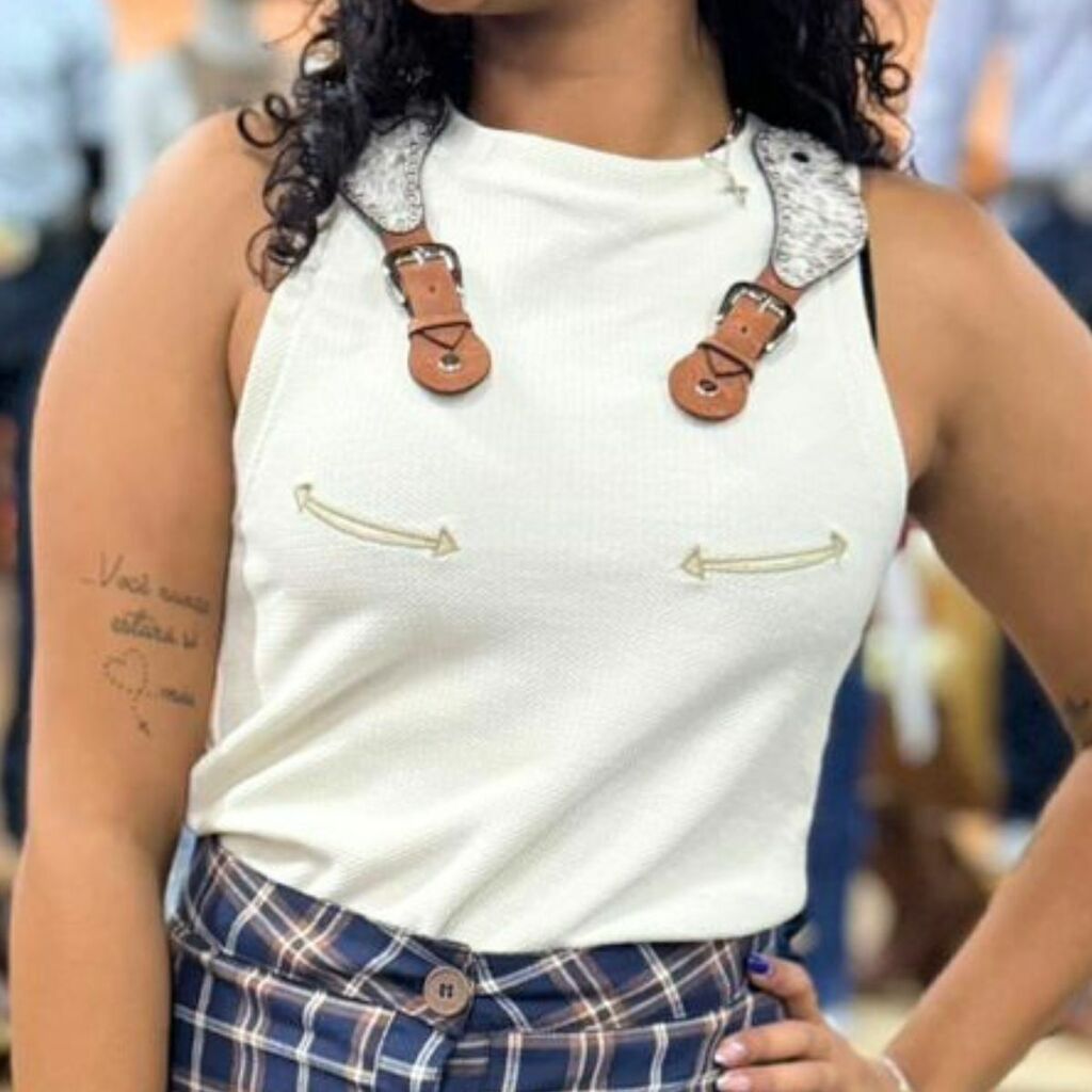Com uma modelagem acinturada e gola redonda, esta regata valoriza a silhueta feminina. O acabamento com viés largo na gola e cava garante um toque sofisticado. Para dar um charme especial, a peça conta com um borrado de bolsinho sorriso na frente, além de uma aplicação de patch em forma de correia de esporas em couro legítimo, que traz um toque rústico e autêntico.