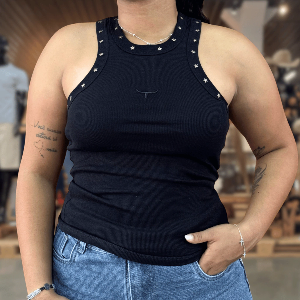 O diferencial está nos detalhes: estrelas metálicas decoram todo o contorno do pescoço e dos braços, trazendo um toque sofisticado e ousado à peça. Na parte frontal, o logo de cabeça de boi estampado reforça a identidade country, ideal para compor looks marcantes e cheios de personalidade.