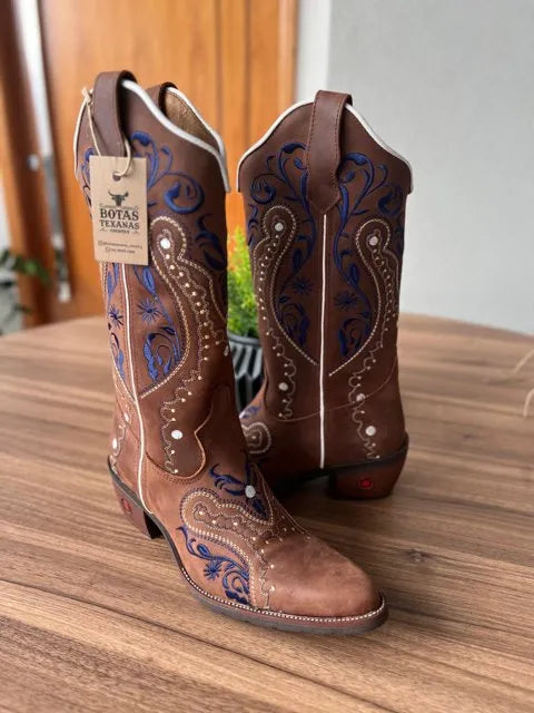 Texana Alice Bico Fino – Couro Horse Nescau/Bordado Tribal Azul