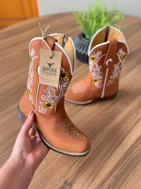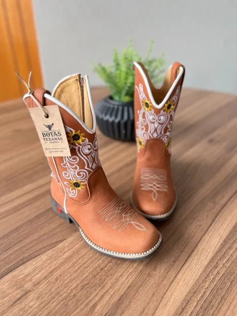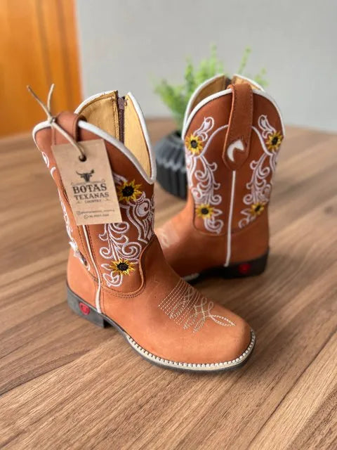 Texana Melinda Infantil – Couro Horse Telha/Bordado Girassol